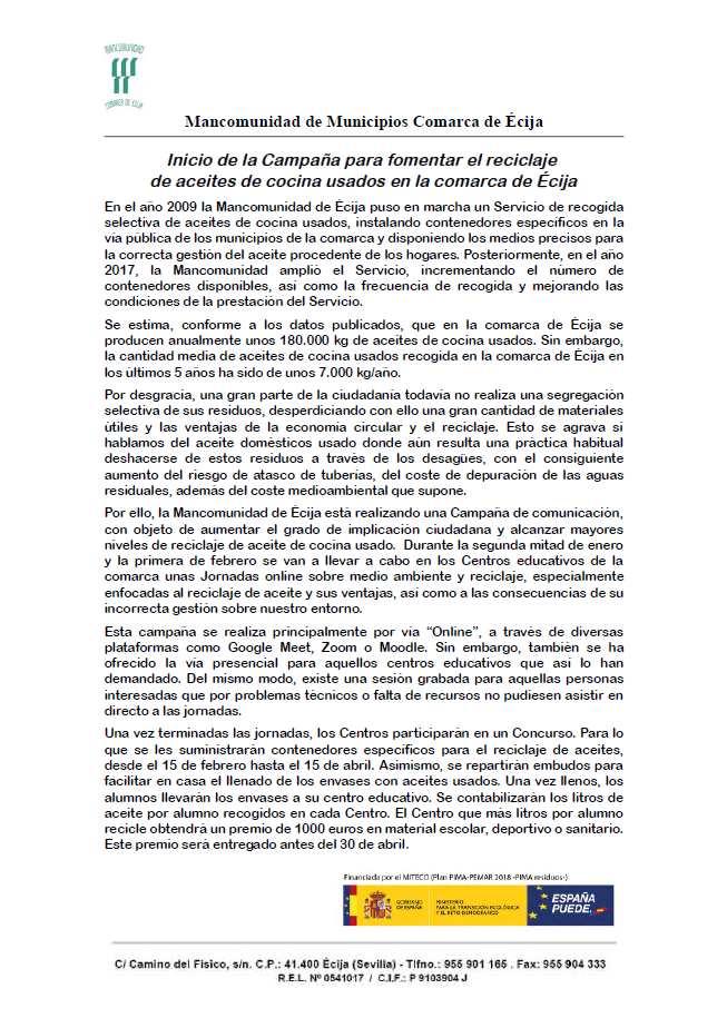 Comienzo de la Campaña para fomentar la correcta gestión de los Aceites de cocina usados en la comarca de Écija Publicada en 9 de febrero de 2021 por Mancomunidad de la Comarca de Écija Medio Ambiente